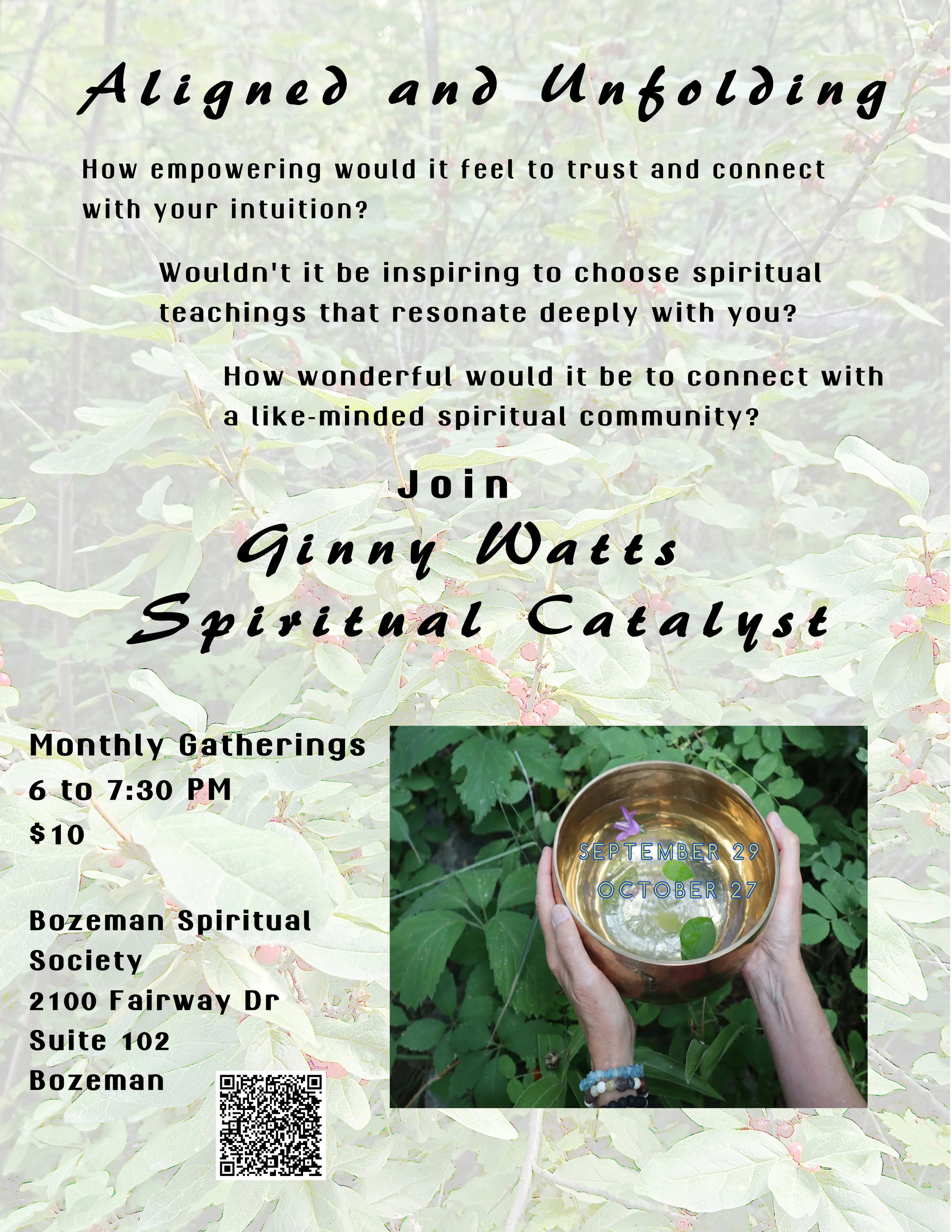 Join Ginny Watts and a group of like-minded spiritual seekers and co-creators to explore connecting with Inner Wisdom, crafting our unique Manifesting style, and learning our personal keys to shift energy in our bodies and in our world.